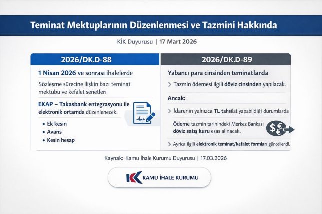 Kamu İhale Kurumu tarafından yayınlanan düzenleyici kurul kararları ile sözleşme sürecinde alınan teminatlar ile yabancı para birimi üzerinden verilen teminat mektuplarının tazminine ilişkin düzenlemeler yapıldı.